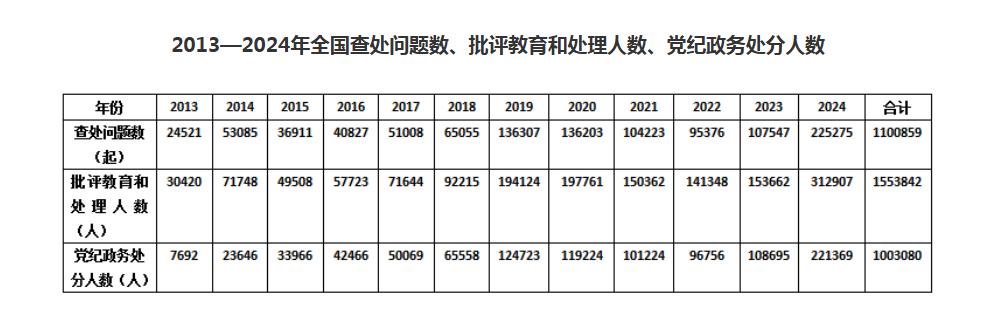 第二,精准查治“四风”水平不断得以提升。在查处问题数量方面,自中央八项规定精神实施至2024年12月,全国共查处问题1100859件。其中2013年4个月累计查处问题24521件,2014年全年查处问题53085件,2024年全年查处问题225275件。2024年查处问题数量大幅增加,是2014年查处问题数量的4.2倍。在处理人数方面,自中央八项规定精神实施至2024年12月,共批评教育和处理1553842人、党纪政务处分1003080人。其中,2014年全年共批评教育和处理71748人、党纪政务处分23646人,2024年全年共批评教育和处理312907人、党纪政务处分221369人。2024年处理人数大幅增加,分别是2014年处理人数的约4.4倍、9.4倍。在执纪执法力度方面,党纪政务处分人数占批评教育和处理人数的比例自2013年至2016年呈现逐年增加趋势,2017年至2020年整体出现小幅下降,但随后又呈现出上升趋势,表明执纪执法力度呈现越往后越严的发展趋势。2024年全年查处问题数、批评教育和处理人员、党纪政务处分人数与2023年相应数据相比,整体上是2023年数据的2倍。2024年数据整体偏高的原因是多方面的,其中重要原因是2024年开展党纪集中学习教育、深入整治群众身边不正之风和腐败问题,执纪执法精细化程度不断提升,监督体系不断健全完善。总之,中央八项规定精神贯彻十多年来统计数据的变化反映了党中央精准查治“四风”水平在实践探索中不断得以提升。