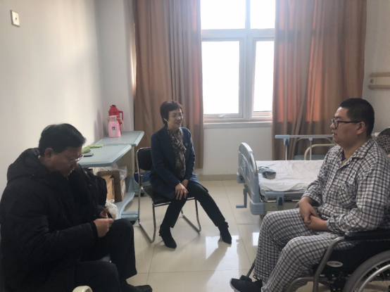 12月11日下午,副院长徐晓红到山东省康复医院代表学校看望慰问患病教职工并送上救助金。徐晓红详细询问了他的身体状况和治疗情况,鼓励他勇于同病魔做斗争,争取早日康复,重返工作岗位。