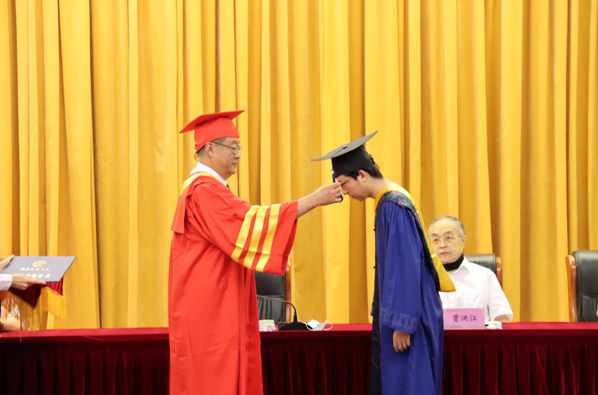 党委副书记、院长陈松岩逐一为学校毕业生代表正冠、拨穗,颁授毕业证书、学位证书。