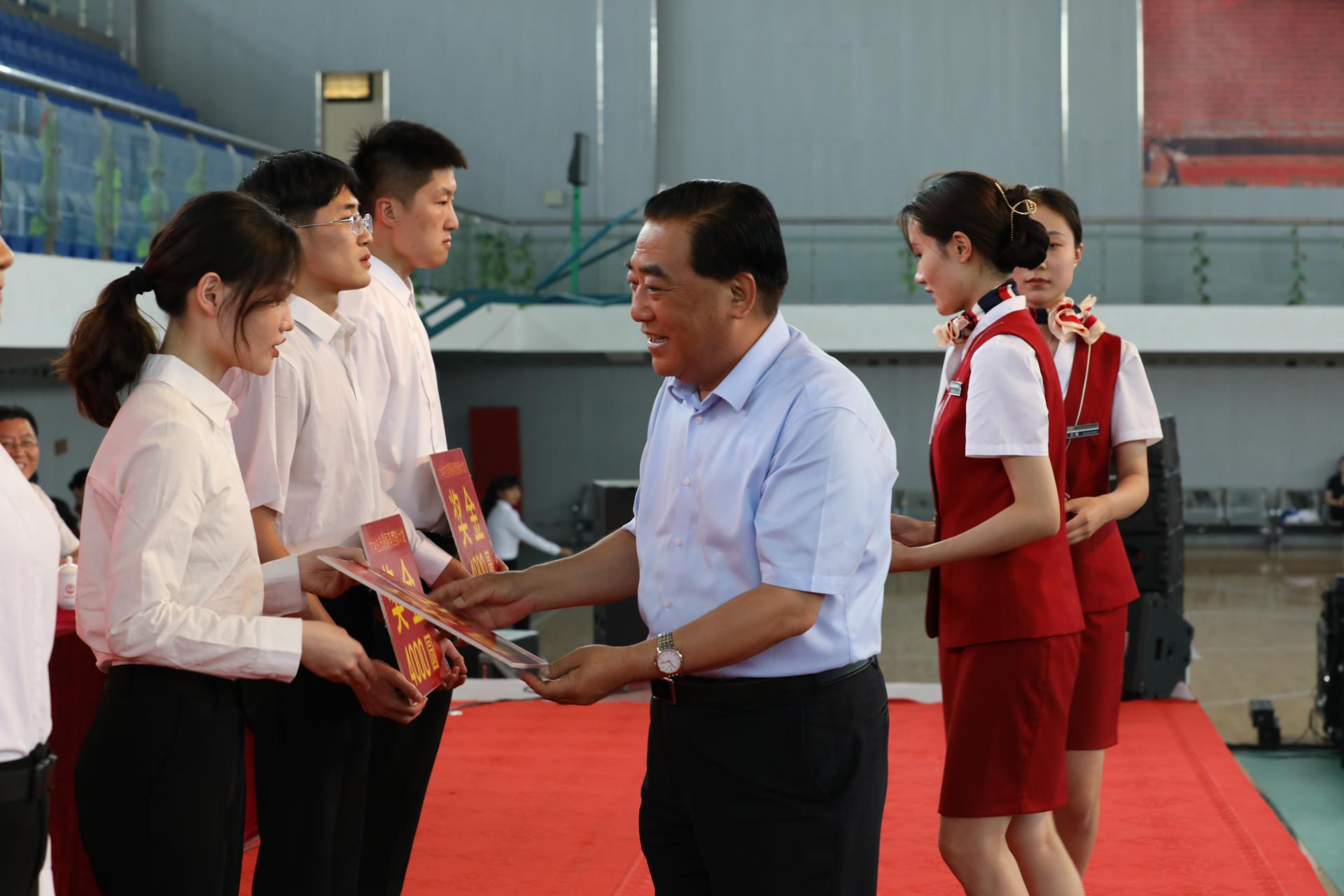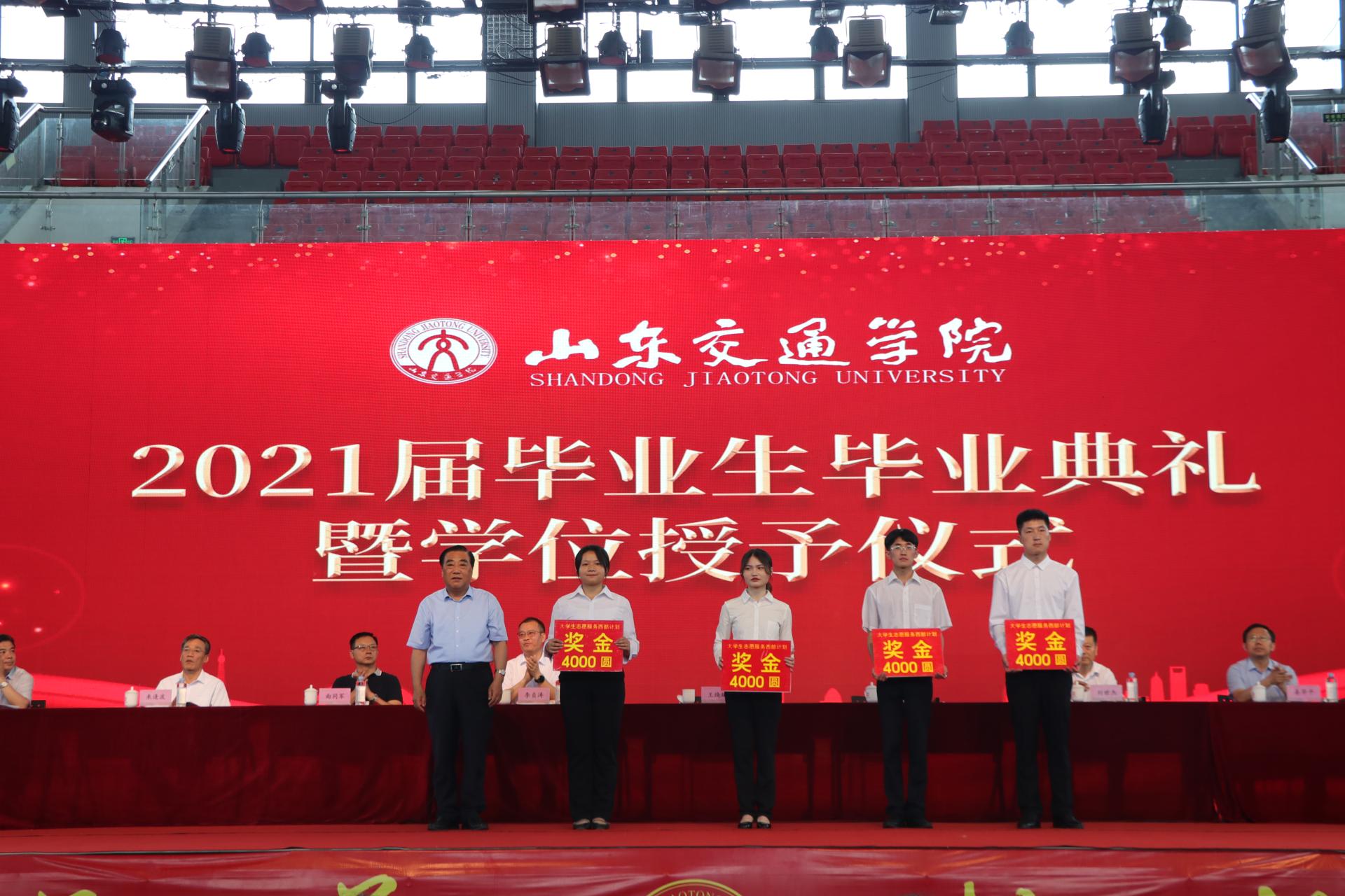 与会学校领导宣读《关于表彰2021届优秀毕业生、自主创业毕业生、西部计划志愿者的通报》,并为获得荣誉的毕业生颁发证书。陈宏霜等761人获得2021届“山东交通学院优秀毕业生”荣誉称号;王玲等383人获得2021届“山东省优秀毕业生”荣誉称号;战文鑫等22人成功创业;4名毕业生参加西部计划志愿者。