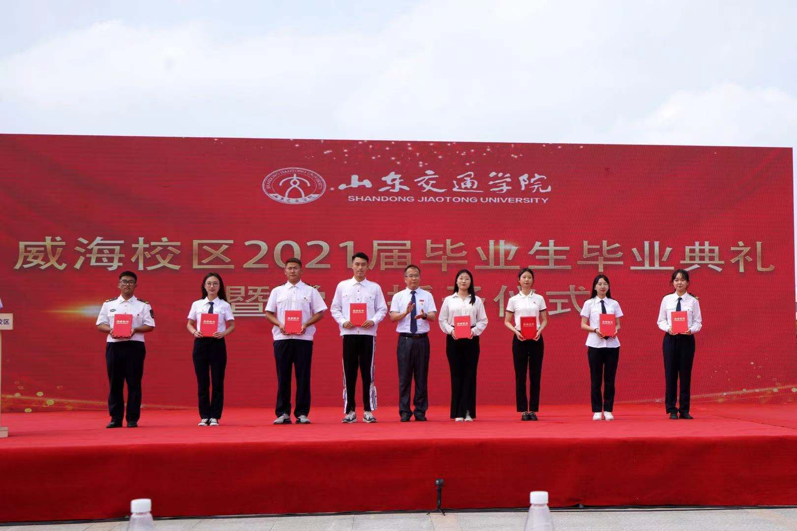 李贞涛为威海校区2021届优秀毕业生代表颁发荣誉证书并合影留念。威海校区管委会相关负责人宣读了《关于表彰2021届优秀毕业生的通报》。