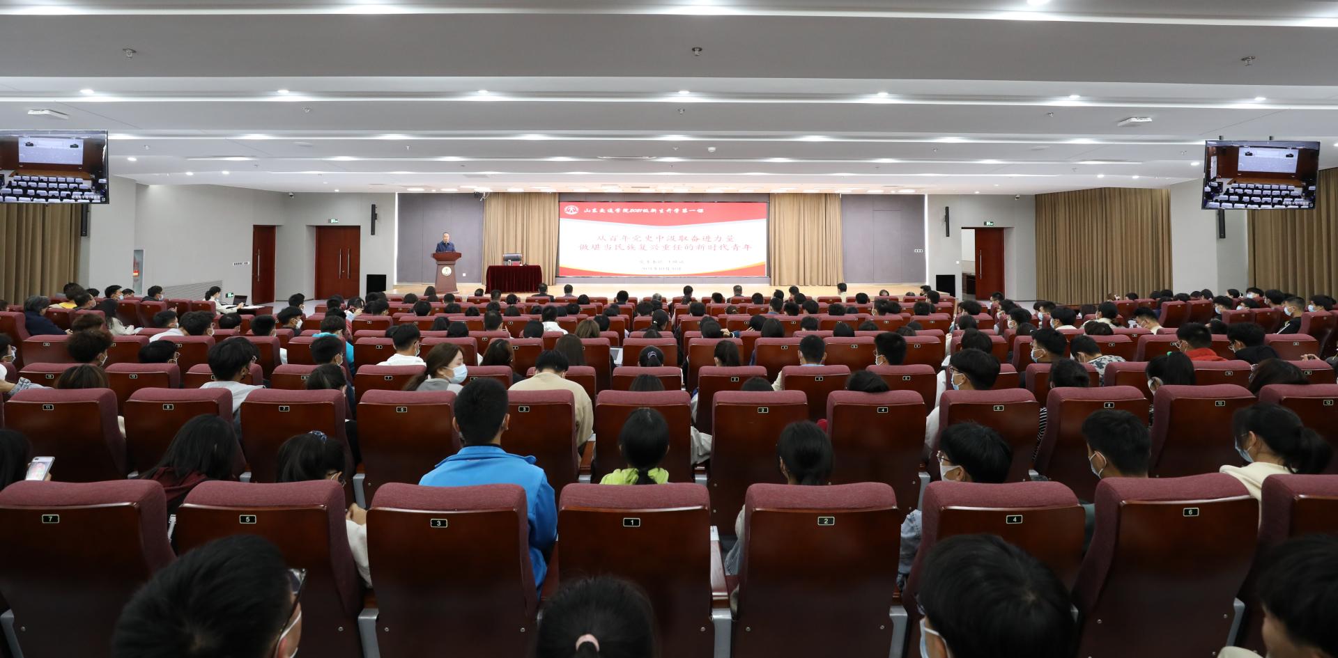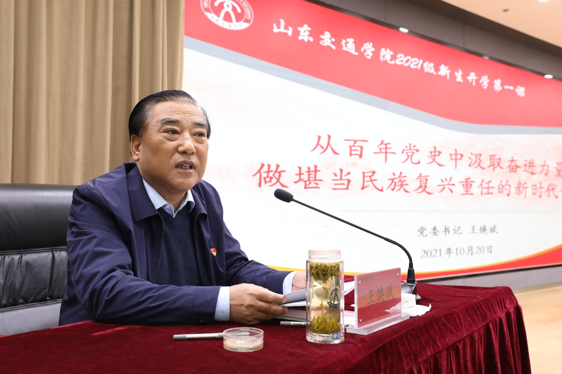 王焕斌首先向2021级新同学表示祝贺,祝贺同学们成为山东交通学院的新成员,开启人生新篇章。他紧扣习近平总书记“七一”重要讲话精神,结合学校发展历史和自身的人生感悟,从“中国共产党的百年辉煌历程”“65岁交院的使命与担当”以及“学党史、担重任,做堪当民族复兴重任的新时代青年”三个方面为同学们讲授课程内容。