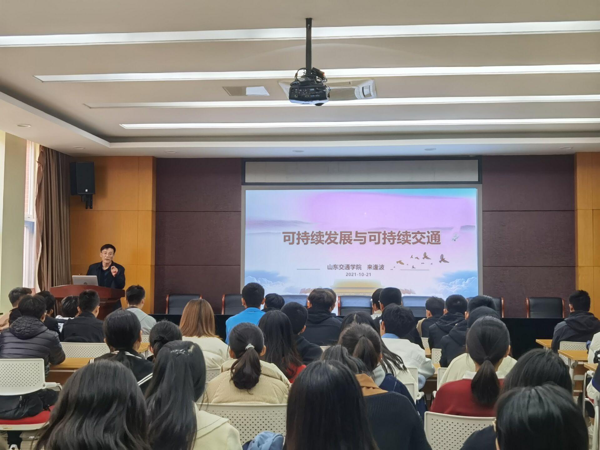 10月21日下午,学校党委委员、副院长来逢波在长清校区1号教学楼B104为经济与管理学院2021级新生代表讲授《可持续发展与可持续交通》专题思政课。