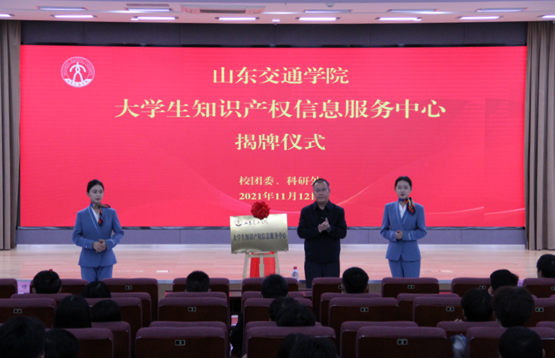 11月12日,学校在长清校区明德楼报告厅举行大学生知识产权信息服务中心揭牌仪式。党委副书记李贞涛出席活动并为中心揭牌。