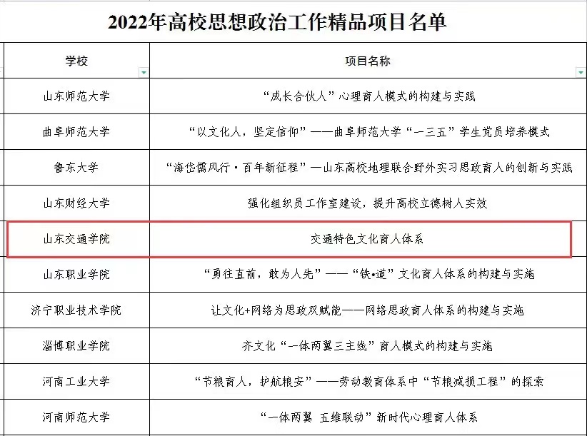 近日,教育部公示了2022年高校思想政治工作精品项目名单,全国共评出100个项目,我校申报的《交通特色文化育人体系》项目成功入选。