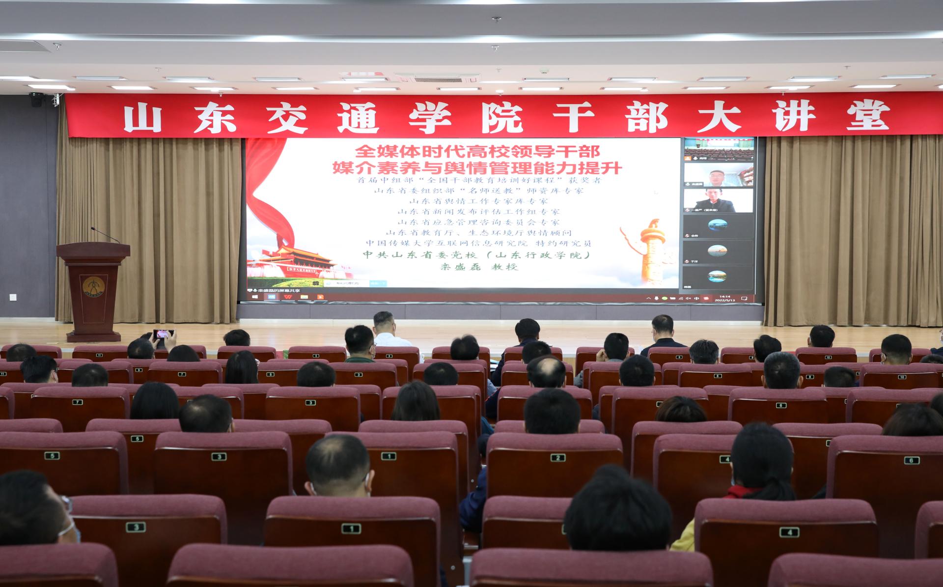 为进一步提升学校领导干部的专业能力和专业精神,5月13日下午,学校在长清校区明德楼101报告厅举办“干部大讲堂”第一讲暨党委理论学习中心组(扩大)集体学习。山东省委党校教授、硕士生导师栾盛磊作《高校领导干部媒介素养与舆情管理能力提升》专题报告。学校党委领导班子成员参加报告会。党委书记王焕斌作动员讲话并主持会议。