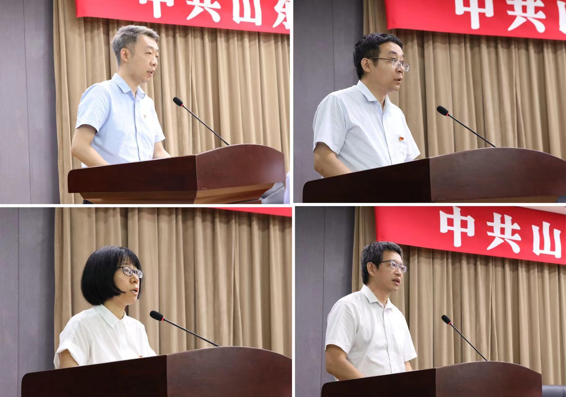 优秀党务工作者代表单成巍、优秀共产党员代表赵光锋(驻菏泽市成武县第一书记)、思想政治工作先进个人代表陈朝霞、统战工作先进集体代表张广渊依次作交流发言。