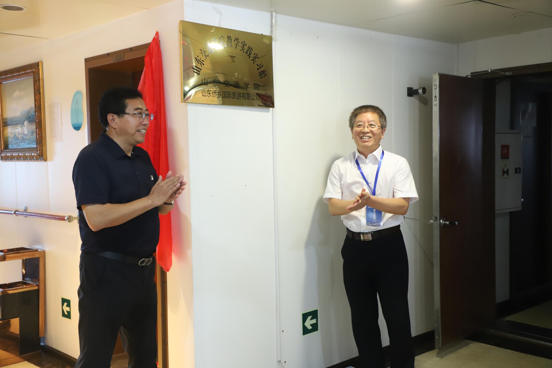 7月28日,学校教学实践实习船揭牌仪式在威海市“侨乡号”游轮上举行。学校党委委员、副院长张化祥,山东侨乡国际旅游有限公司总经理姜兵出席仪式并为实习船揭牌。