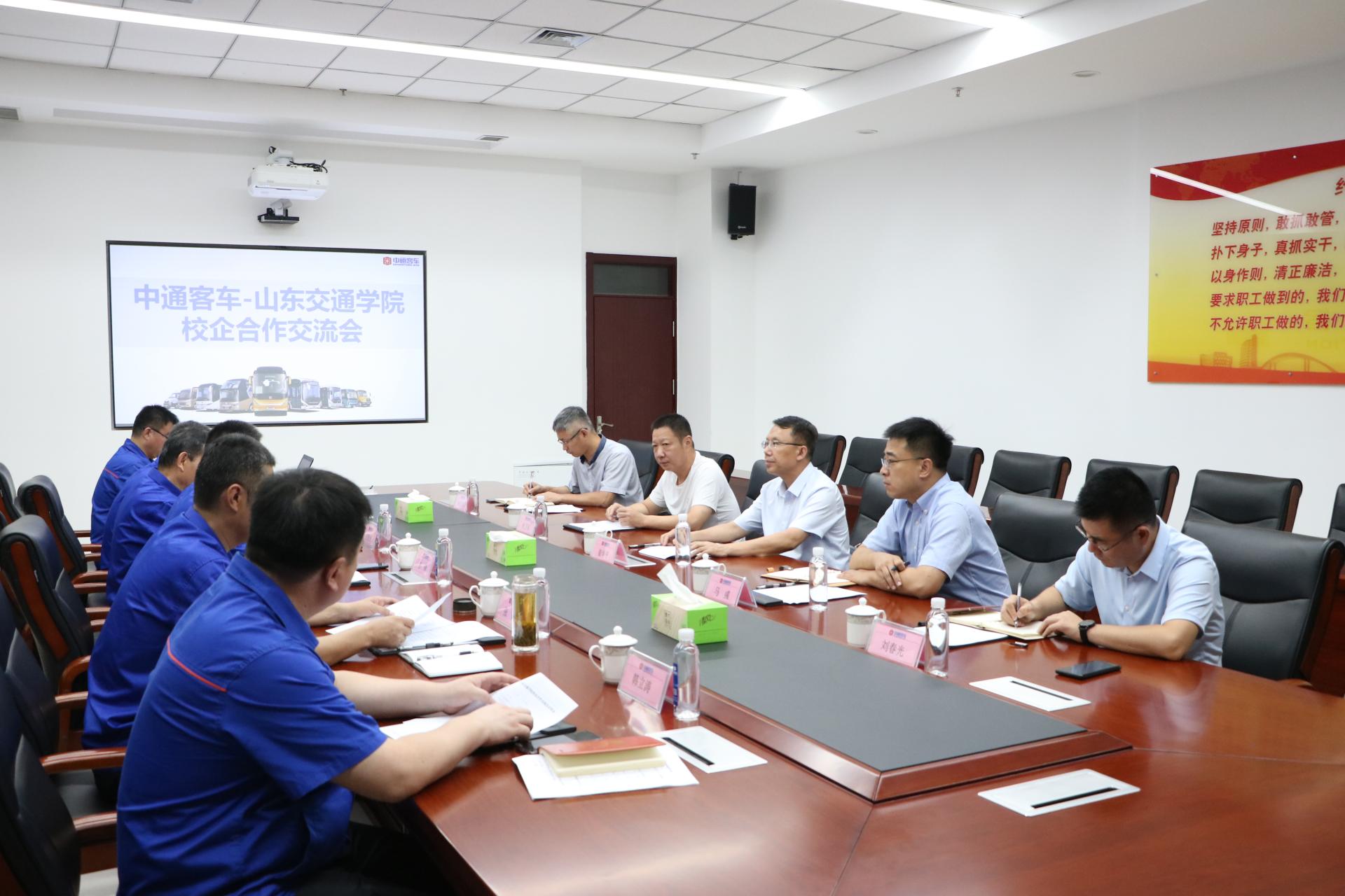 姜华平对中通客车股份有限公司多年来对学校建设和发展提供的支持表示衷心感谢,介绍了我校应用型人才培养的典型经验和工作成效,强调了教师队伍加强企业任职锻炼的重要意义。姜华平指出,学校智力资源应充分与企业应用实践相结合,校企双方应深度合作,加强企业数字化转型升级发展,实现合作共赢。他重点介绍了学校国际化领域的业务范畴和主要成果,提出了双方可落地实施的合作方式和内容。彭锋对姜华平一行的到来表示热烈欢迎,介绍了近年来中通客车股份有限公司的发展理念、核心产品及经营状况,并重点分析了国际业务的发展历程、国别布局和主要业绩。他表示,公司将继续加强与山东交通学院在人才培养与发展、产品研发、成果转化等方面的交流与合作,并通过订单班形式加强国际化人才储备,将校企合作做实做细,落到实处。