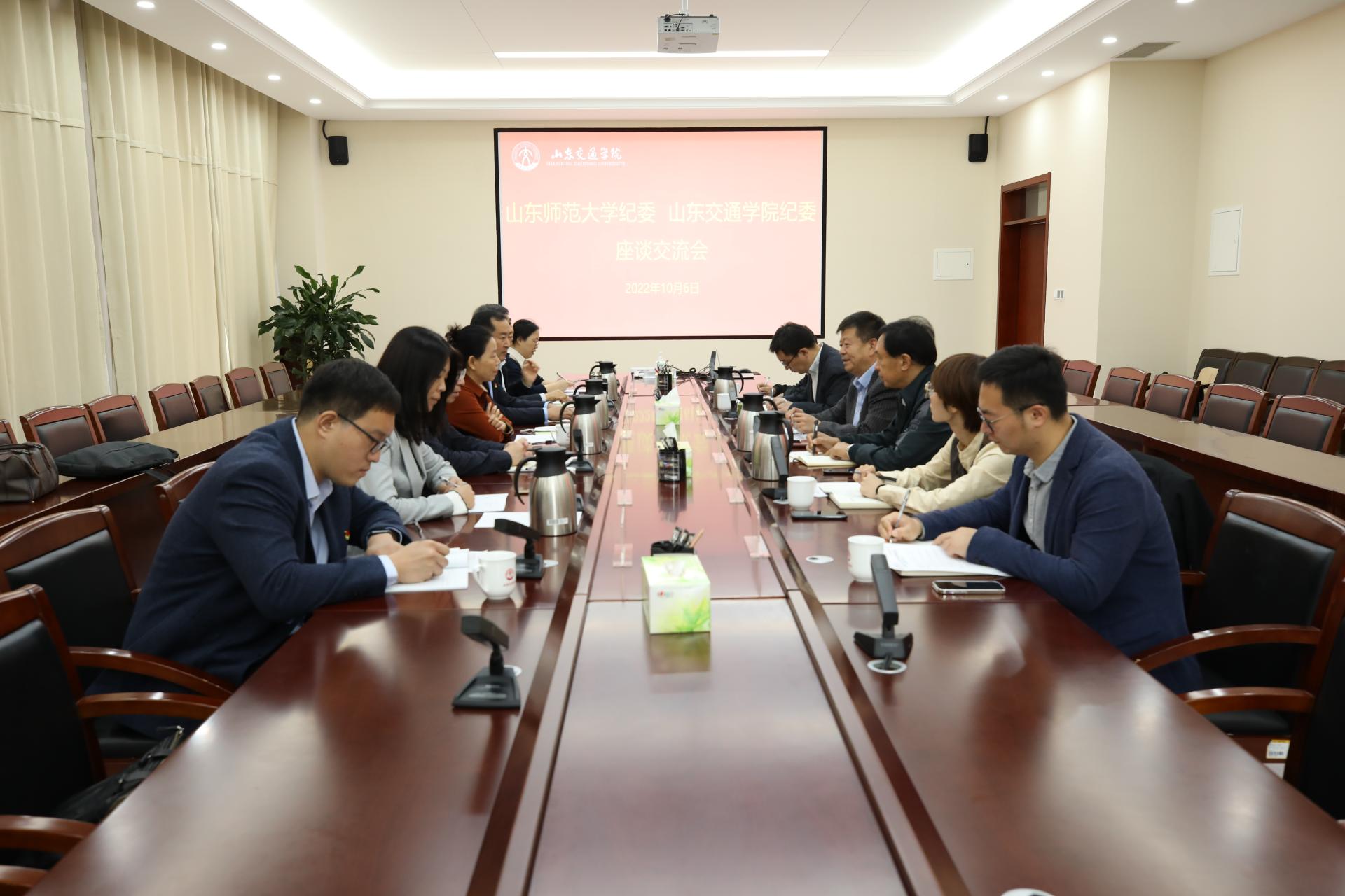刘世杰主持召开座谈会。他对周婧一行的到来表示热烈欢迎,简要介绍了学校基本情况和纪检监察工作开展情况,希望以此次座谈为契机,双方深入开展支部共建,推动两校廉洁文化建设和纪检监察工作高质量发展。周婧感谢学校的热情接待,对我校各项业务工作的开展和校园文化建设取得的成绩给予高度评价。她介绍了山东师范大学纪委近期工作开展情况,希望两校加强沟通交流,互相学习借鉴,携手共进,共谋发展。