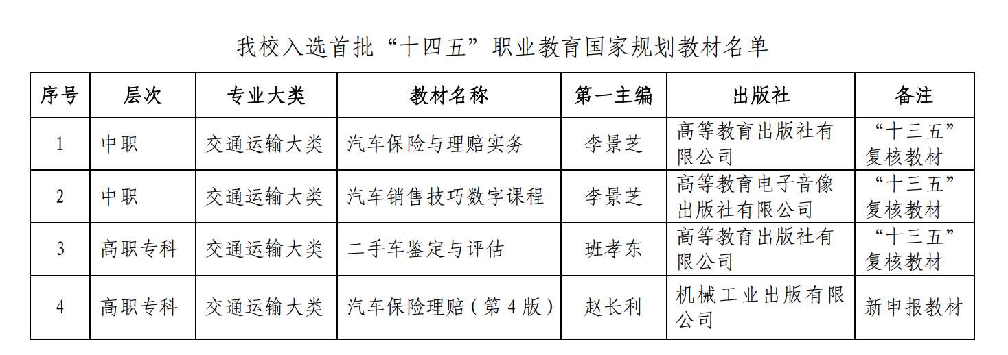 近日,教育部公布首批“十四五”职业教育国家规划教材书目,我校有4部教材入选,其中,“十三五”复核入选3部,新申报入选1部。