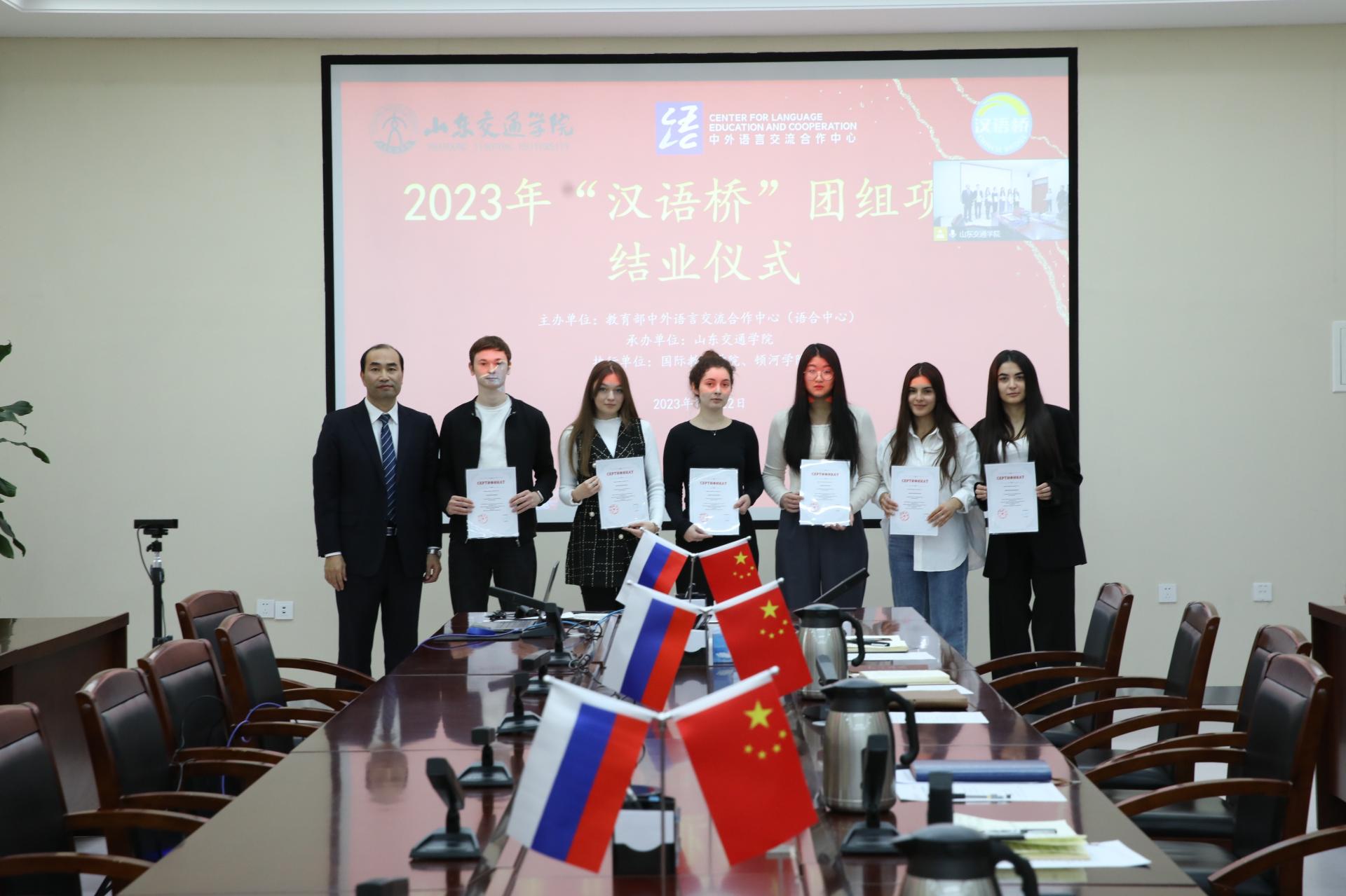 12月22日下午,学校在长清校区明德楼301会议室举行2023年“汉语桥”线上团组项目和“共赴齐鲁文化之约”冬令营线下团组项目闭营仪式。学校党委副书记、院长孔伟金,党委委员、副院长姜华平;俄罗斯顿河国立技术大学校长梅什西·别萨里昂·乔霍耶维奇,副校长别斯科贝里内·阿列克谢·尼古拉耶维奇出席仪式。仪式由姜华平主持。