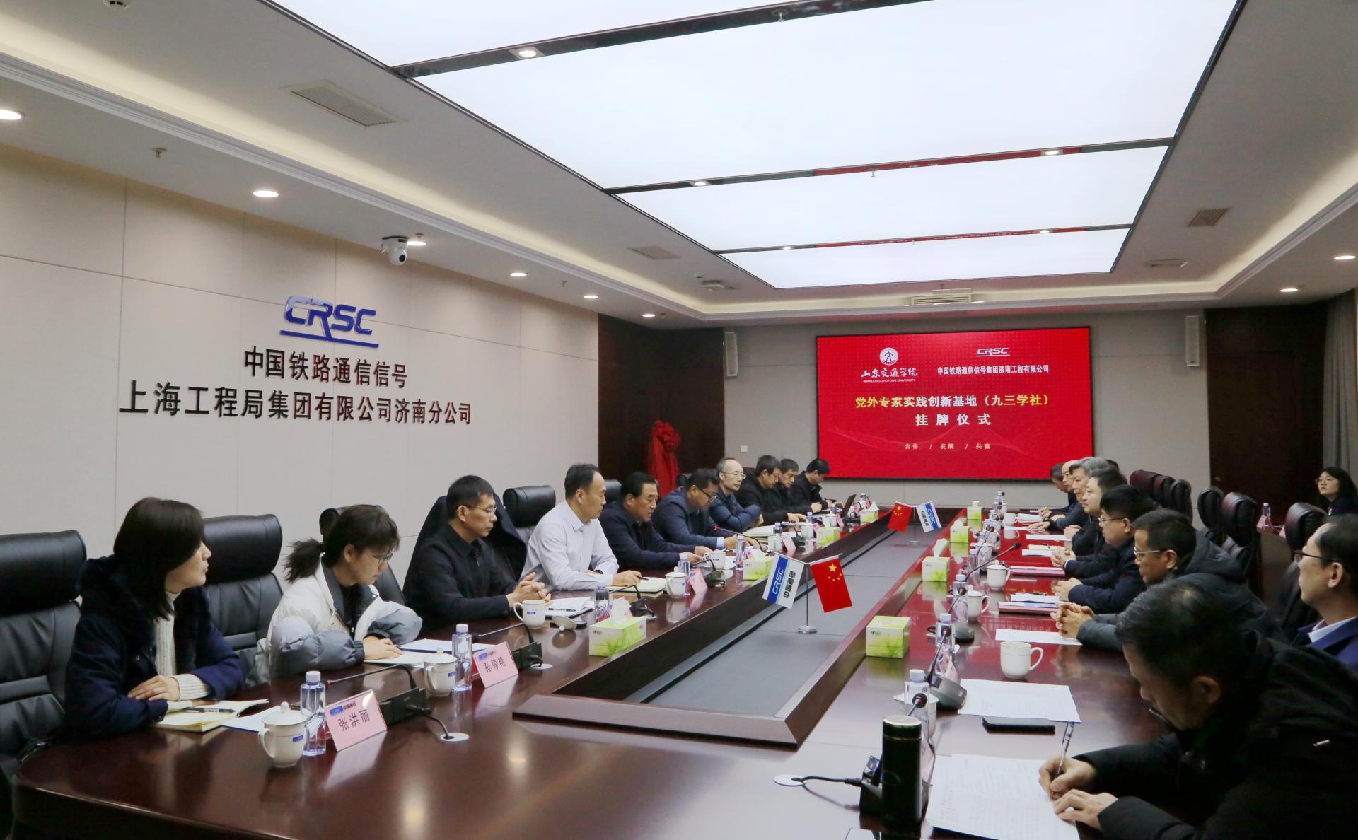 1月8日,学校党外专家实践创新基地(九三学社)揭牌仪式在中国铁路通信信号集团济南工程有限公司会议室举行。学校党委书记王焕斌、中国铁路通信信号集团济南工程有限公司党委书记谢德胜出席活动。