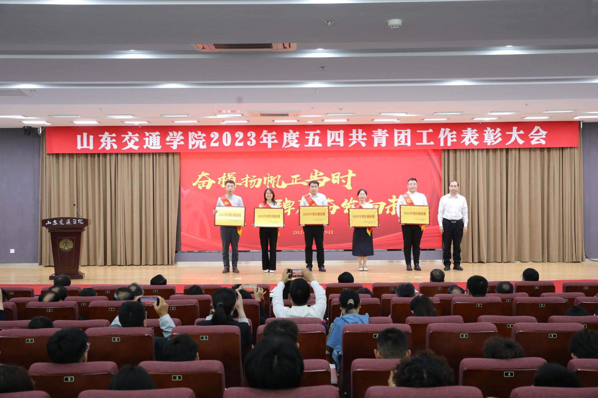 与会领导为2023年度优秀共青团员、优秀共青团干部、优秀共青团员标兵获得者代表,创新创业竞赛标志性成果获得者代表,先进团支部、红旗团支部、共青团模范工作者、红旗团委、高水平学术科技和创新创业“登峰杯”获奖学院依次颁奖。