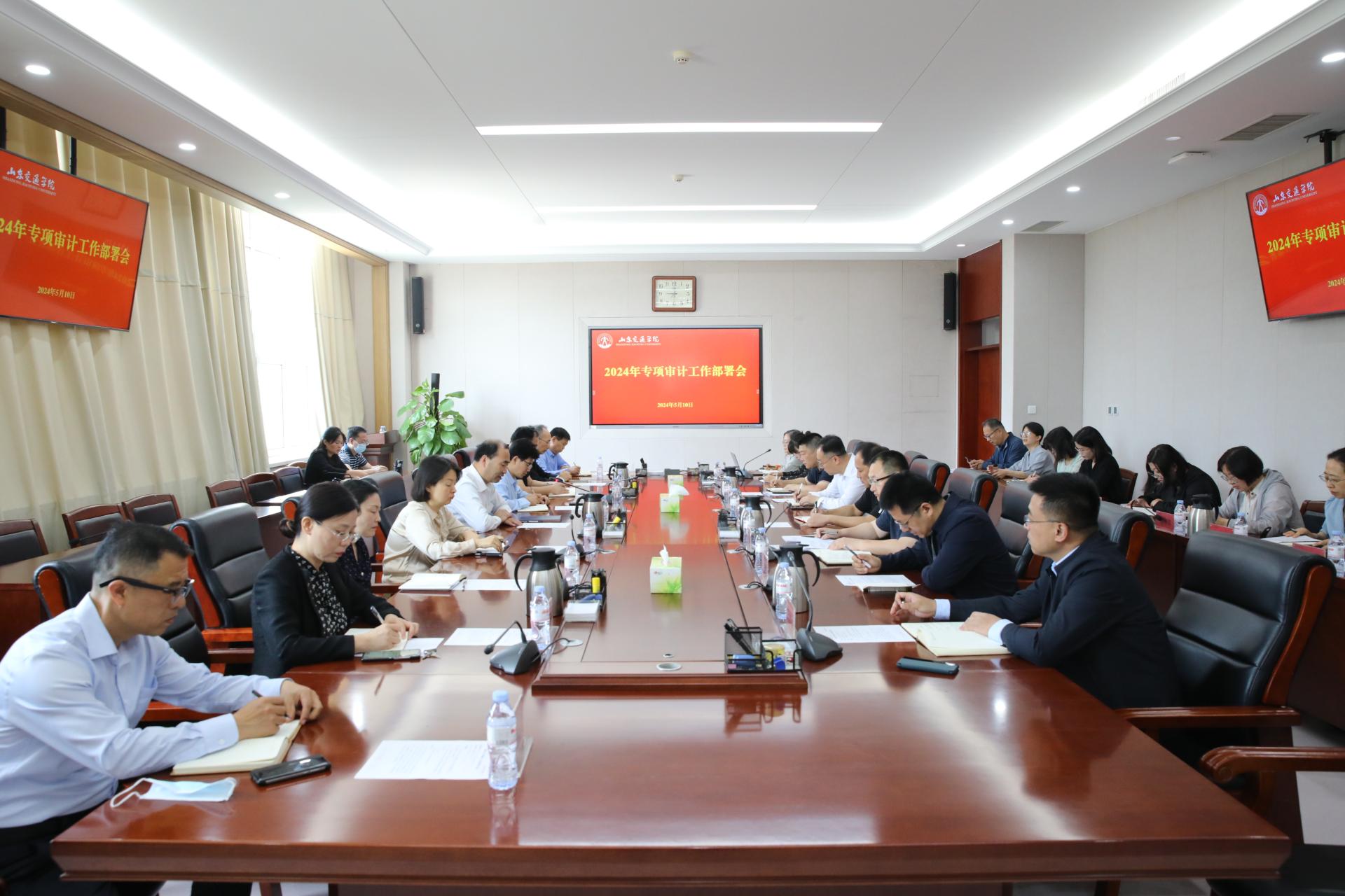 党委办公室(学校办公室)、学生工作处、发展规划与学科建设处、人力资源处(教师工作部、人才工作办公室)、教务处、科研处、研究生工作处、招生就业处、财务处、国际合作交流处(台港澳事务办公室)、资产管理处、后勤管理处、安全管理处、产教融合办公室、团委、图书馆、信息化建设与管理中心、继续教育学院、威海校区管理办公室、济南山交教育咨询服务有限公司主要负责人及专项审计联络人参加会议。
