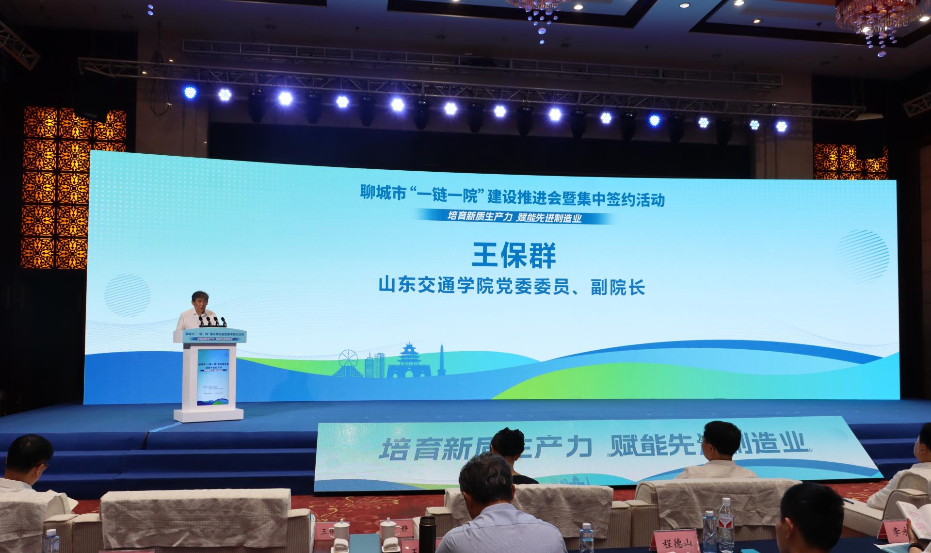 5月14日上午,聊城市人民政府组织召开聊城市“一链一院”建设推进会暨集中签约活动,聊城市委副书记、市长张百顺出席并致辞。学校党委委员、副院长王保群应邀出席。