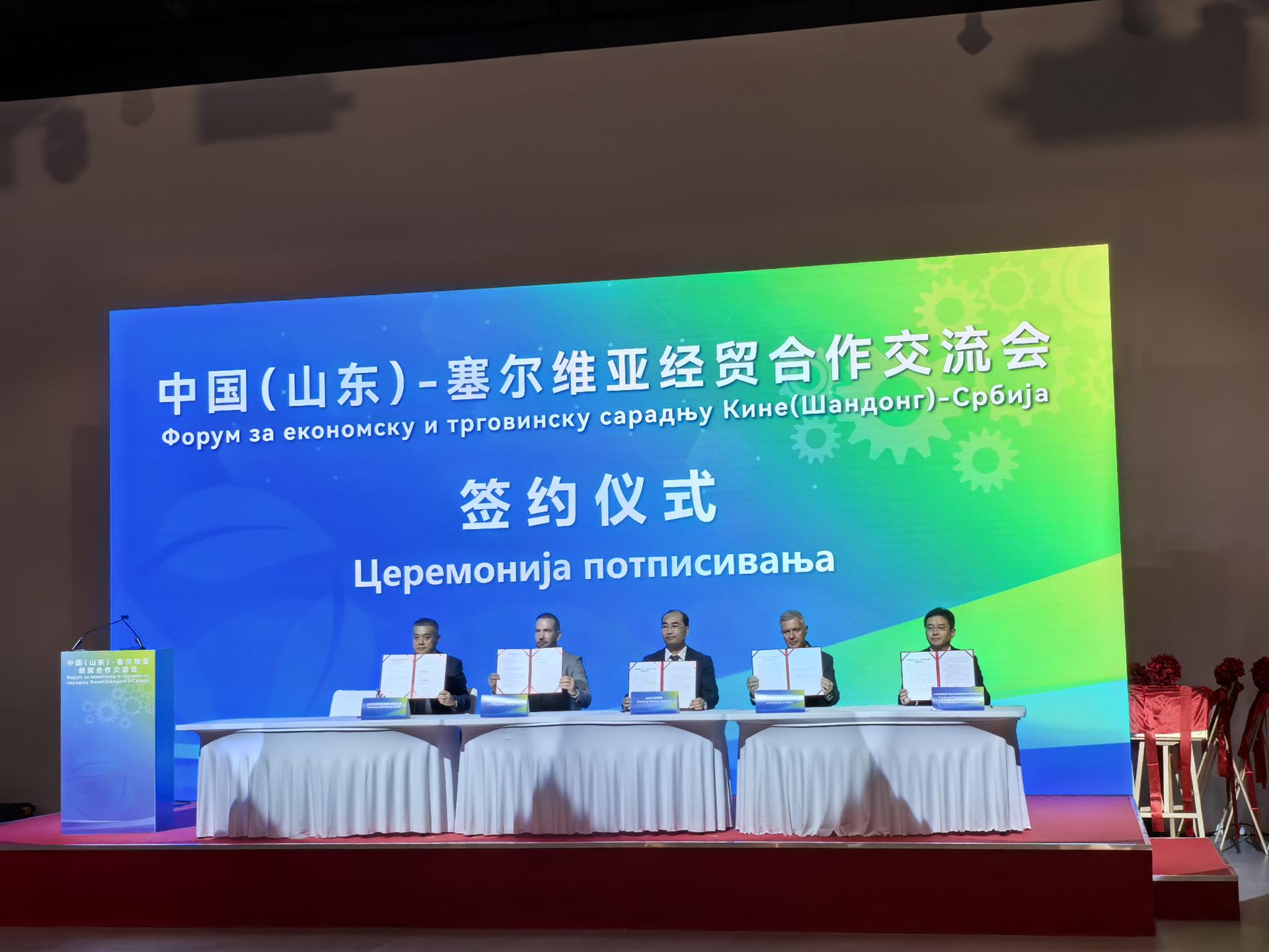 在塞尔维亚期间,代表团应邀参加山东省在贝尔格莱德萨瓦会议中心举行的中国(山东)—塞尔维亚经贸合作交流会,学校与山东高速集团、塞尔维亚科学与艺术学院签署“共同推进中国(山东)—塞尔维亚产教融合发展谅解备忘录”。