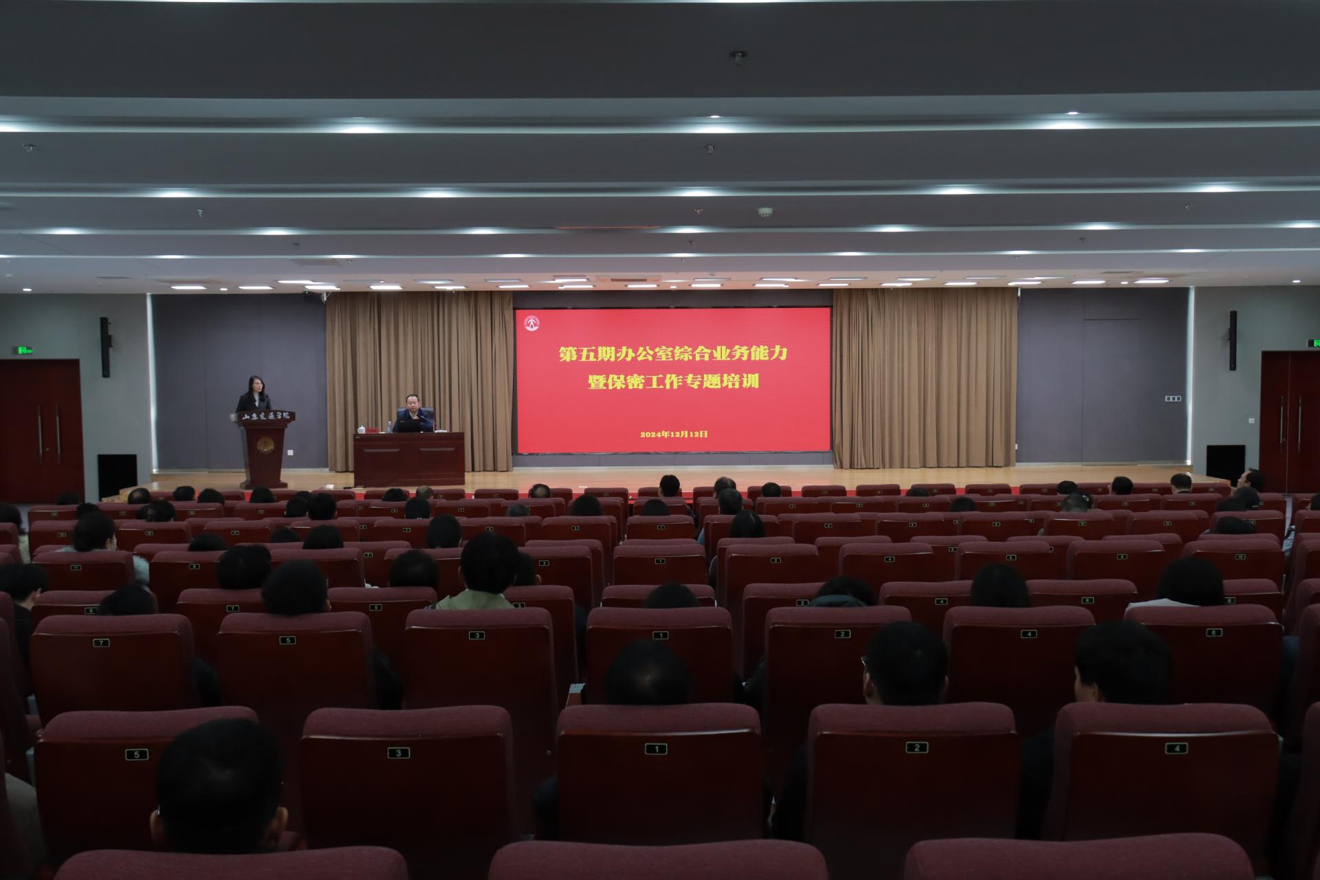 12月12日,学校在长清校区明德楼101报告厅举办第五期办公室综合业务培训班,邀请山东省涉密载体销毁中心副主任王瑞卿作专题报告。学校党委委员、党委组织部部长王兴盈出席并主持会议。