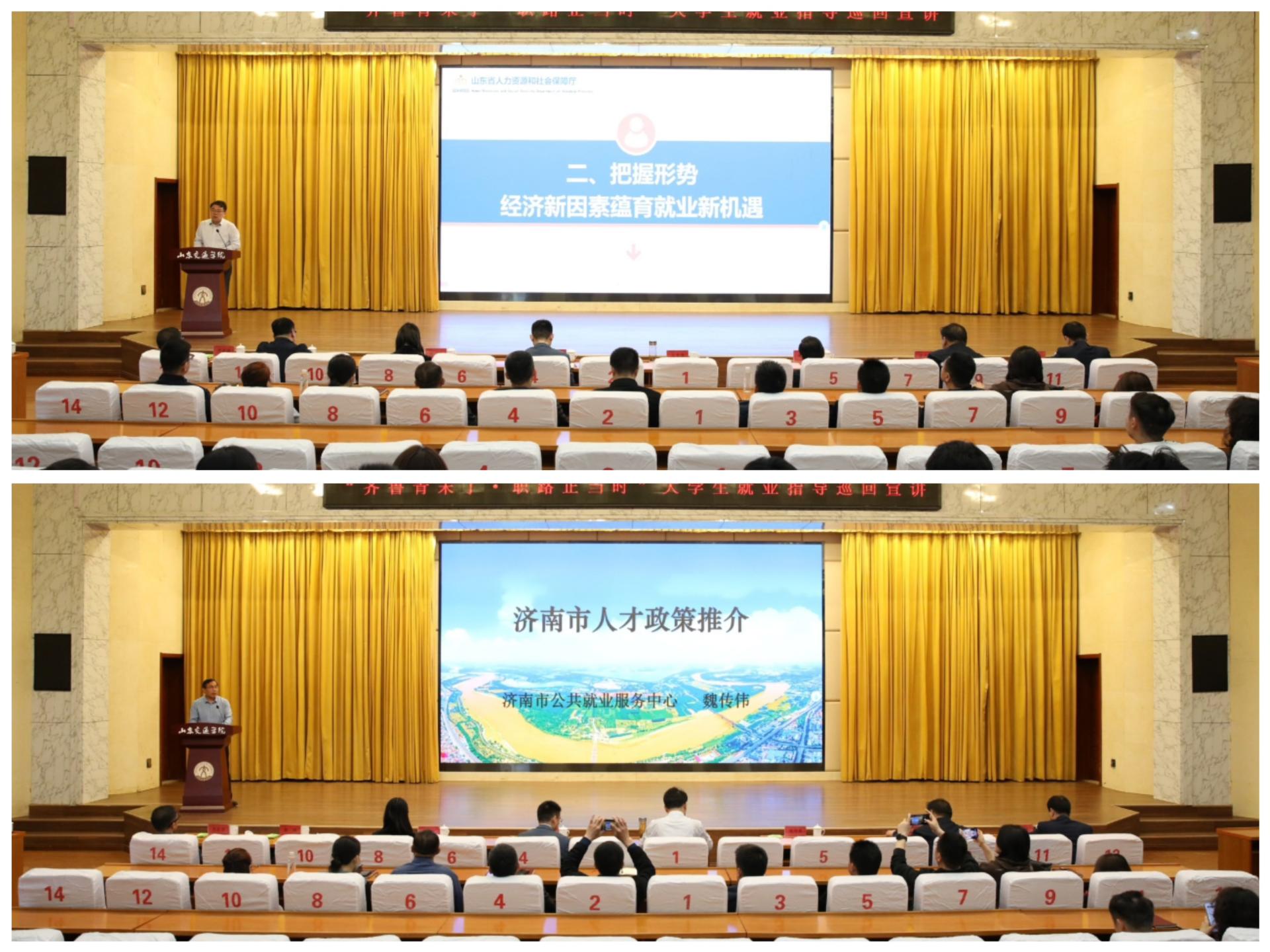 山东省公共就业和人才服务中心、济南市公共就业服务中心相关负责人;我校研究生工作处、招生就业处负责人,长清校区各二级学院学生工作负责人,2025届、2026届毕业班辅导员,学生代表参加活动。