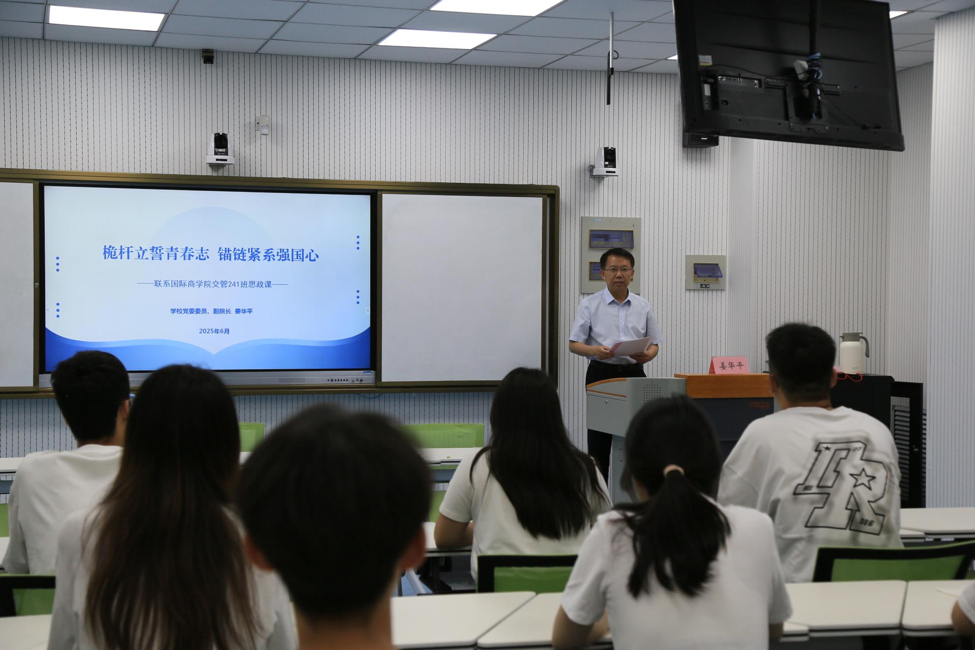 学校党委委员、副院长姜华平以《桅杆立誓青春志 锚链紧系强国心》为题,为国际商学院交管241班学生讲授思政课。他结合交通运输领域的鲜活案例和发展前沿,深刻分析了国家发展大局和交通行业面临的重大战略机遇与挑战,详细阐述了新时代对交通管理人才提出的新要求、新期待。他指出,交通是兴国之要、强国之基,交通管理专业作为国家战略和科技前沿相融合的专业,肩负着服务交通强国战略、推动交通行业进步的重要使命。他寄语同学们要筑牢思想根基,锤炼过硬本领,担负青年使命,用智慧和汗水为交通强国建设贡献力量。