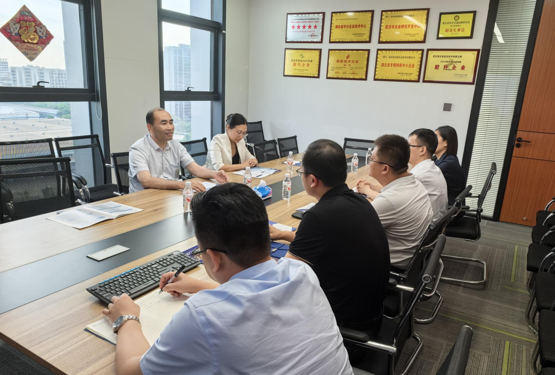 在武汉泰沃滋信息技术有限公司,公司总经理韩金波介绍了企业核心业务范围及与我校的合作成效,孔伟金详细了解了双方合作科研项目的进展情况。双方围绕毕业生招聘、实习实践基地建设、科研项目联合申报等展开深入交流并达成多项共识。