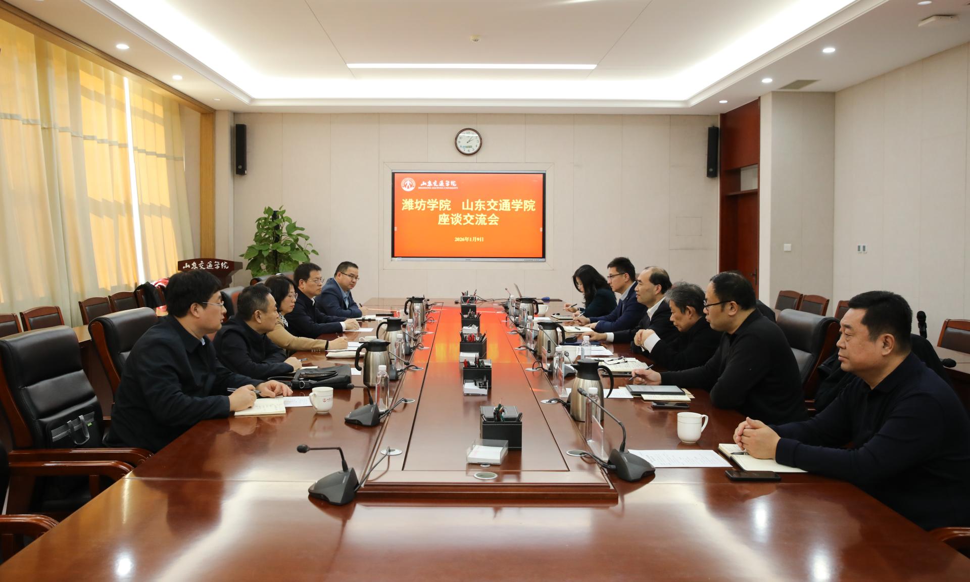 1月9日下午,潍坊学院党委副书记、校长王霞一行来我校调研交流。座谈会在长清校区明德楼303会议室召开。学校党委副书记、院长孔伟金,党委委员、副院长王保群出席。会议由王保群主持。