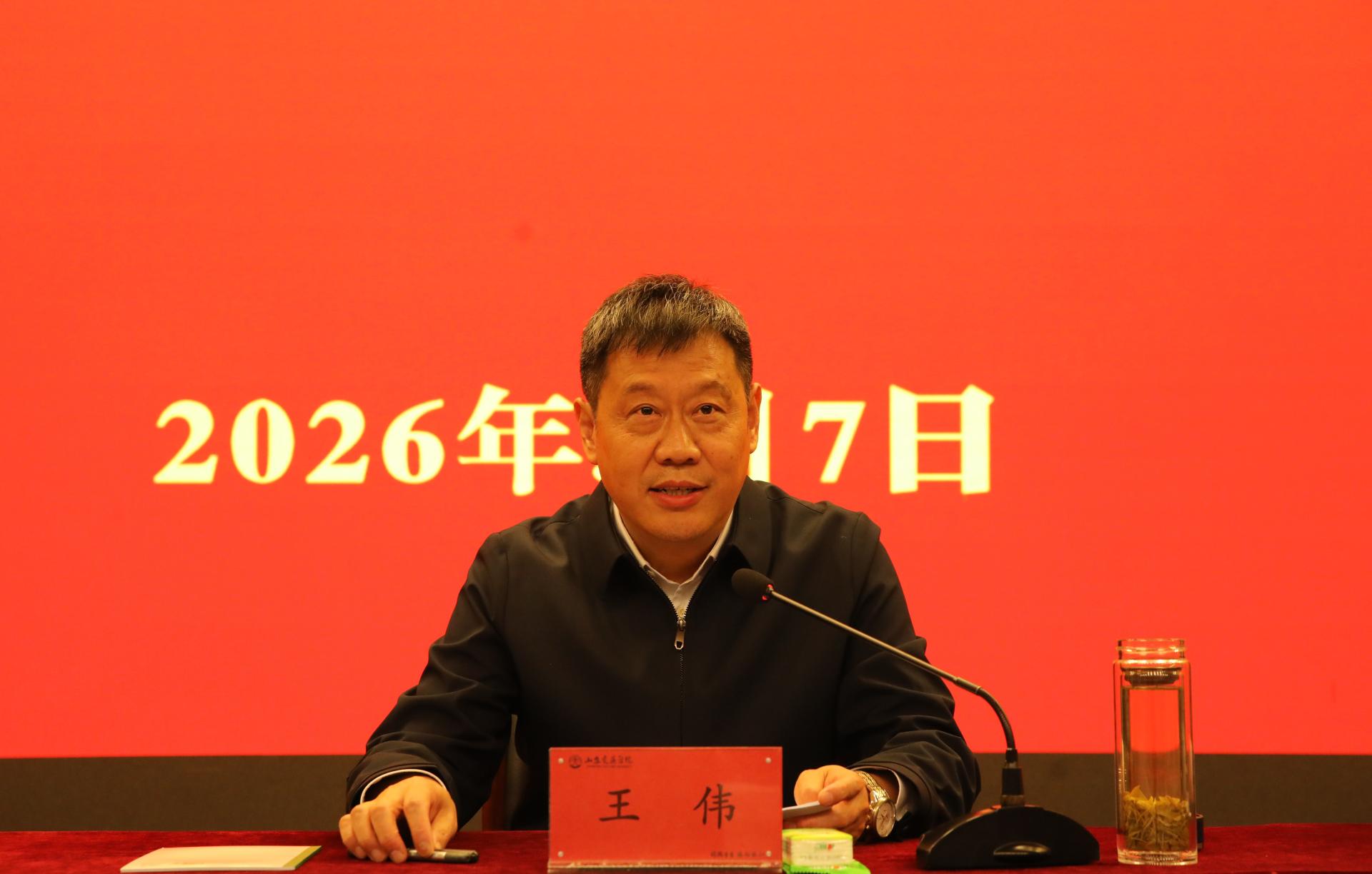 党委书记王伟作重要讲话。他简要总结了学校2025年的办学成绩和办学经验,客观分析了学校当前所处的历史方位,并对学校发展方向进行了战略谋划。他强调,未来5-10年是学校高质量发展的关键时期,广大干部职工要敢于打破思维定势,心往一处想、劲往一处使,主动担当、积极作为,以“时不我待、只争朝夕”的紧迫感,以“功成不必在我、功成必定有我”的责任感,切实将各项部署要求转化为具体行动,确保各项目标任务落地见效。他要求,一要明确目标任务,构建清晰的发展坐标体系。要兼顾当前与长远,按照“一年攻坚起势、三年提质达标、五年跨越突破,十年提升创优”的总体思路,构建与“十五五”规划深度契合的发展路径,一步一个脚印,把宏伟蓝图变为美好现实。二要聚焦关键环节,拿出更加务实的具体行动方案。要以“大胆想、科学干”的态度谋划发展,以“抓改革、促创新”的勇气破解难题,以“强统筹、聚合力”的态势主动发力。三要强化责任落实,形成更加高效的执行保障机制。要把责任压实到岗、传导到人,坚决防止责任悬空、任务落空,形成清晰可追溯的责任闭环;要健全以实绩和贡献为导向的考核评价机制,让有为者有位,出力者出彩,实干者实惠,激发干事创业的内生动力;要营造实干氛围,大力弘扬“严、真、细、实、快”的工作作风,形成一级带着一级干、一级做给一级看的生动局面。他号召,全校师生员工要以奋发有为的精神状态和实干进取的奋斗姿态,共同为谱写学校高质量发展新篇章贡献智慧和力量。