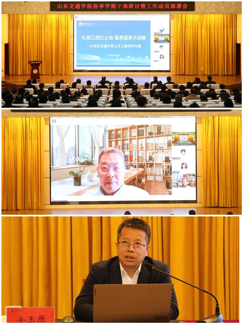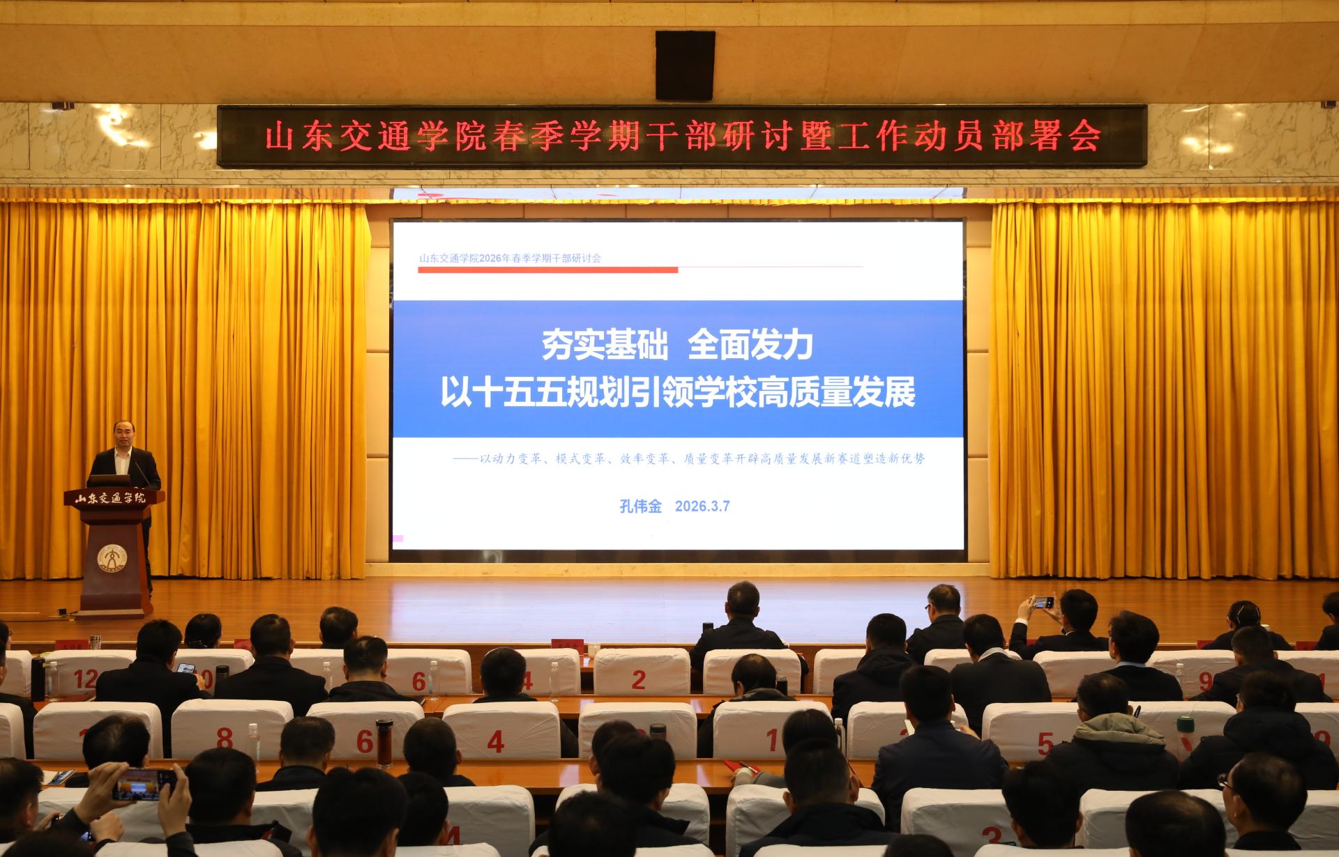 党委副书记、院长孔伟金作动员讲话,并作题为《夯实基础、全面发力,以“十五五”规划引领学校高质量发展》的主旨报告。他全面总结了学校“十四五”时期取得的主要成就,深入剖析了学校发展面临的形势,系统阐释了“十五五”时期学校的总体发展目标和行动举措,并对2026年度重点工作进行部署。他指出,“十五五”时期是学校承前启后、夯实基础、全面发力的关键攻坚期,要以全面深化综合改革为动力引擎,深入实施“党建强基领航、卓越人才培优、学科提质攀登、科研攻坚突破、校地融合发展、人才集聚强校、国际合作拓新、文化铸魂育人、综合改革赋能、保障能级跃升”等十大重点工程,持续强化交通特色,优化资源配置,激发办学活力。他强调,2026年是“十五五”规划的开局之年,也是学校确定的“内涵建设攻坚年”,要按照“1-3-6-10”工作思路,聚焦“高质量党建引领高质量发展”主题,实现“高层次人才、标志性科研成果、标志性人才培养质量”三大突破,统筹做好“学科专业体系、科技创新体系、平台团队体系、办学条件体系、制度文化体系、开放合作体系”六项基本建设,围绕十大攻坚任务重点做好“‘十五五’规划编制、应用型本科院校建设、省级重点特色学科建设、硕士学位点申报、人工智能+行动、卓越人才培养、科研创新与服务交通强国、师资队伍建设、国际合作办学、基本办学条件建设”等工作,全力推动学校实现高质量发展。