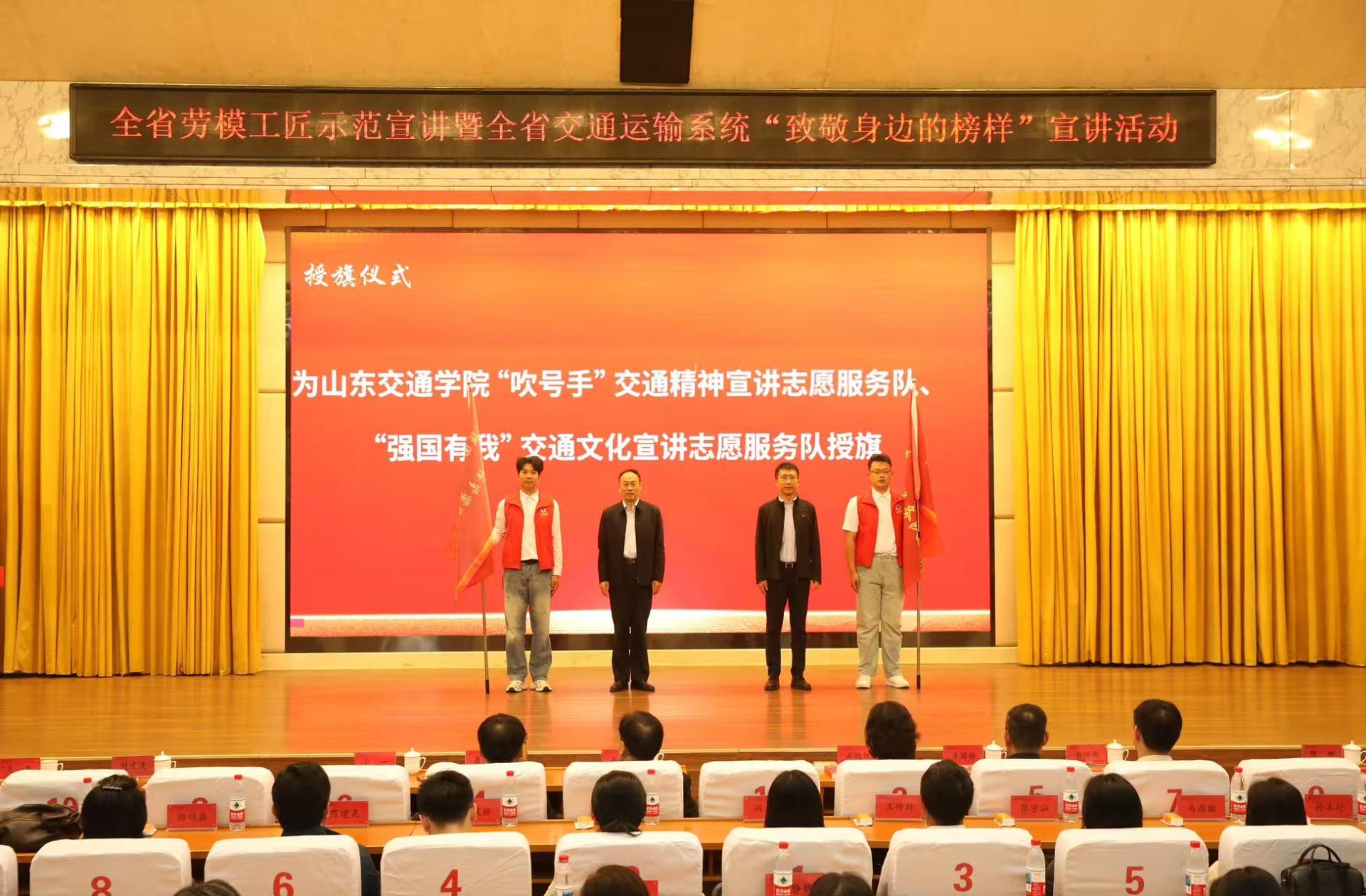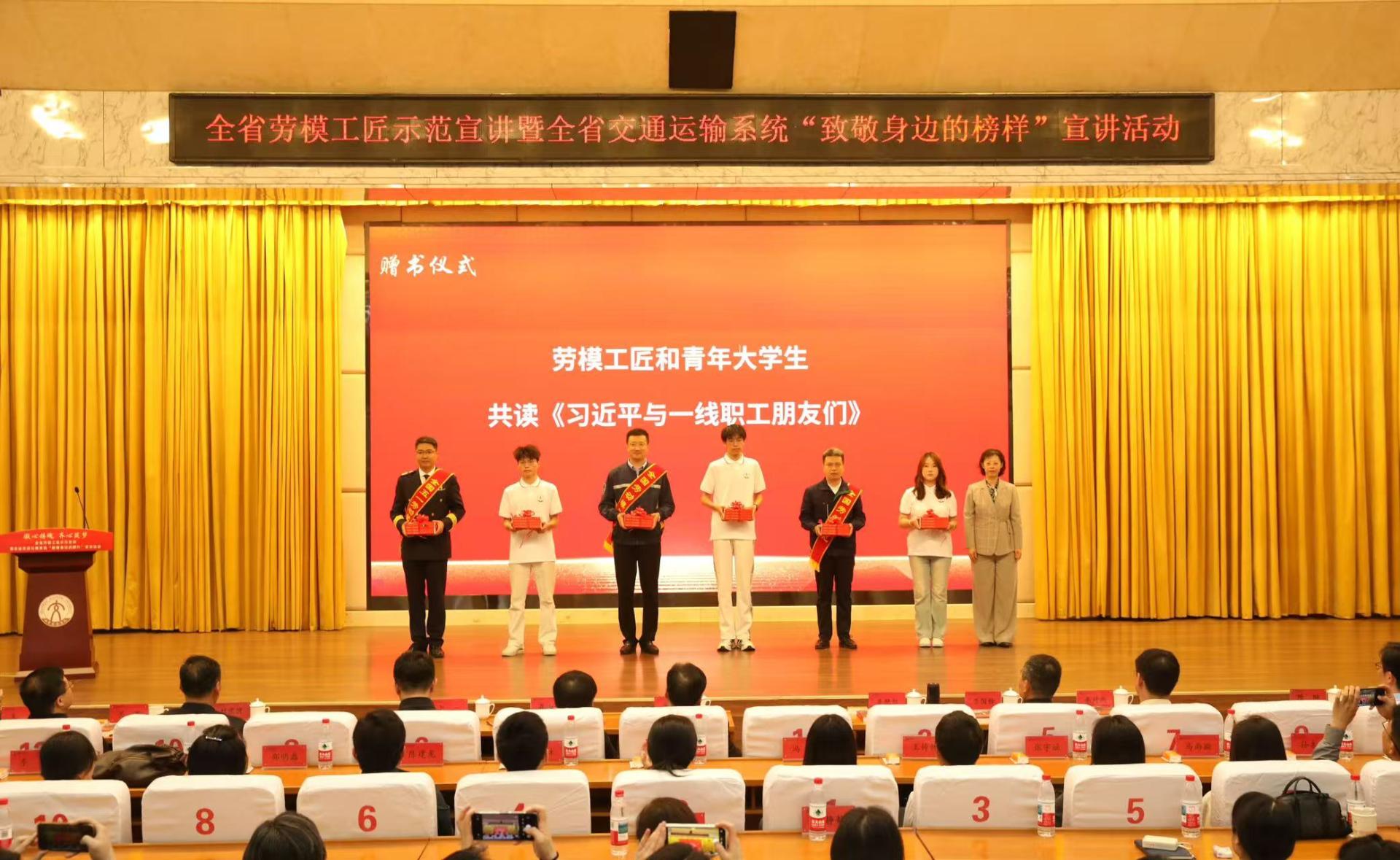 会上,省交通运输厅政研室主任卜一、刘庆波共同为学校“吹号手”交通精神宣讲志愿服务队和“强国有我”交通文化宣讲志愿服务队授旗;省交通工会主席、一级调研员牟艳红向劳模工匠及青年大学生代表赠送《习近平与一线职工朋友们》,激励青年学子与职工向榜样看齐、向先进学习。