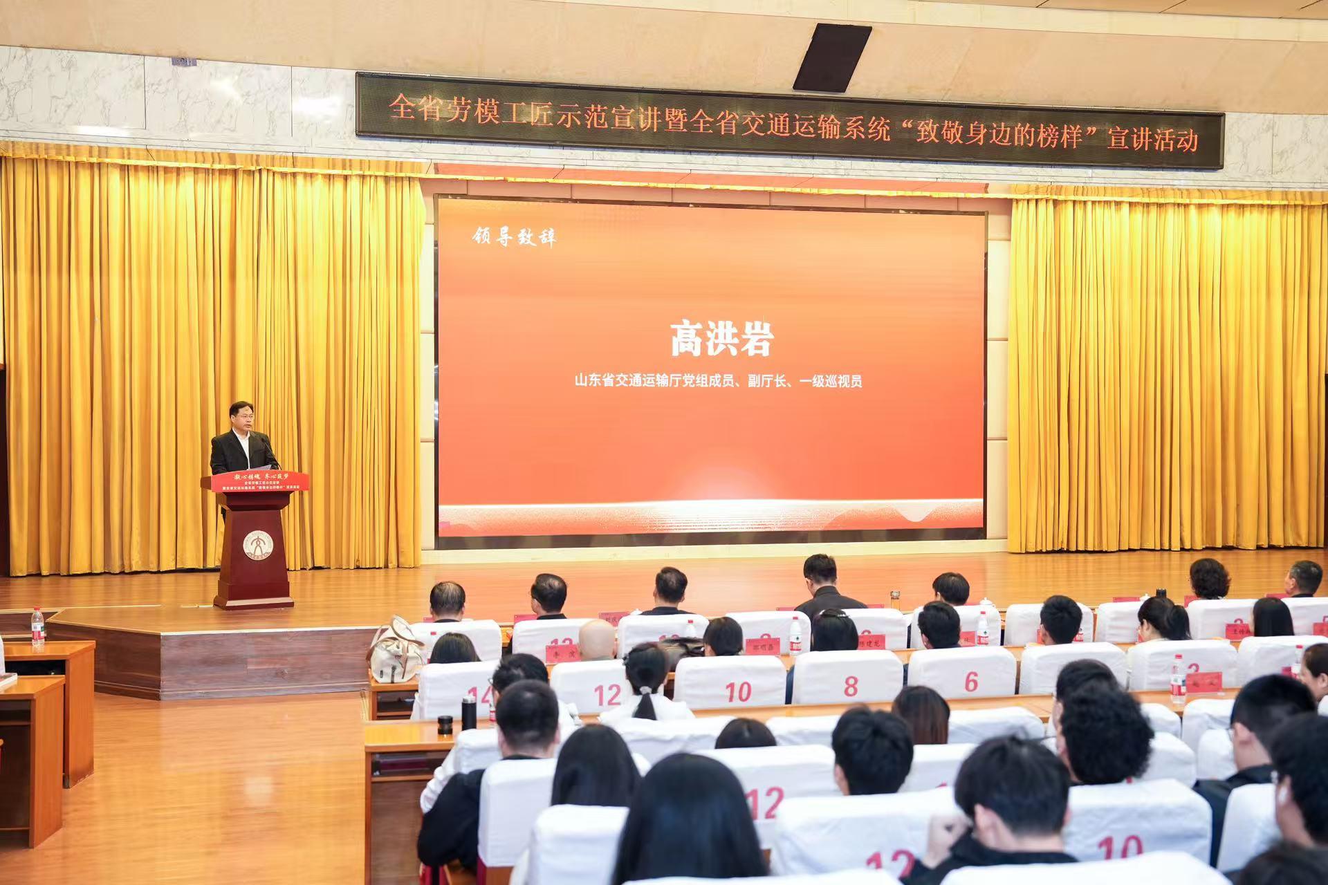 高洪岩简要介绍了全省弘扬新时代交通精神、选树“交通劳模”“交通工匠”等先进典型的工作开展情况。他表示,本次宣讲活动旨在通过劳模工匠讲述各自奋斗经历,传递山东交通正能量,激励全行业广大干部职工勇立潮头、踔厉奋发、争创一流。希望大家坚守初心使命、扛牢责任担当,以先进为榜样,为实现交通人的强国梦、强省梦努力拼搏、不懈进取、奋勇前行。