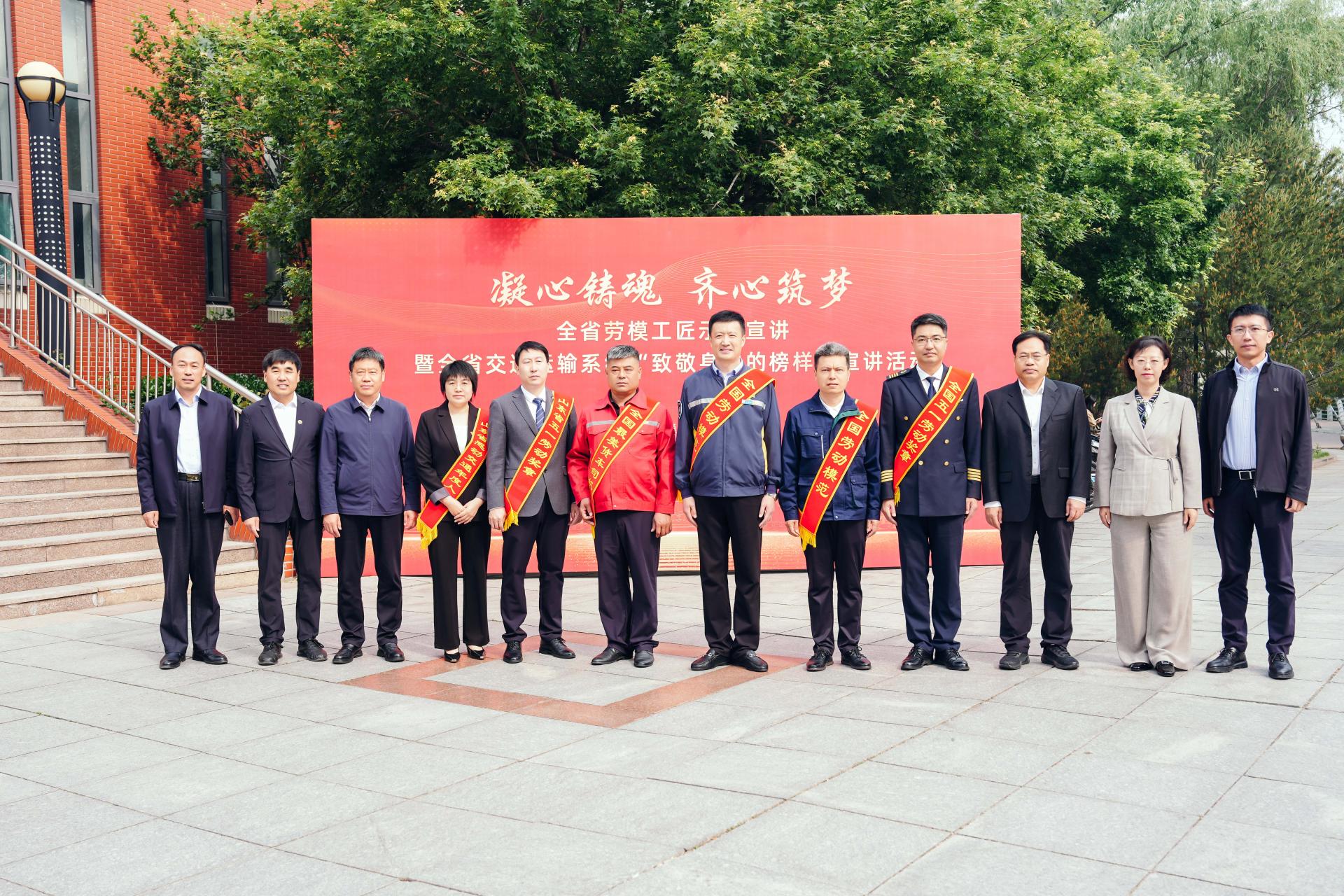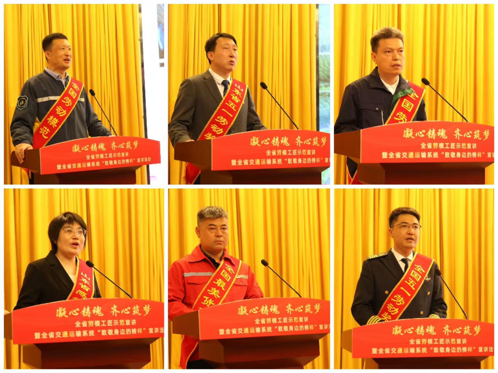 在劳模工匠宣讲环节,6位来自交通一线的榜样人物依次登台,分享坚守岗位、匠心筑梦的奋斗故事。于义睦深耕公交一线27年,以“五心四点”工作法温暖万千乘客,带动数千人投身志愿服务;高峰扎根港航领域,以科技创新打造智慧港航平台,助力济宁港成为北方内河首个亿吨大港;尹星三十载钻研轨道交通检修,带领团队攻克多项行业难题,斩获多项国家专利;刘娜娜扎根沂蒙山区,用脚步丈量路线,以实干打造精品公路,助力老区振兴;王端战坚守货车驾驶岗位二十余年,百万公里零事故,多次见义勇为、热心公益;丁茂家深耕航海一线22年,安全航行36万海里,以专业守护海上运输安全。
