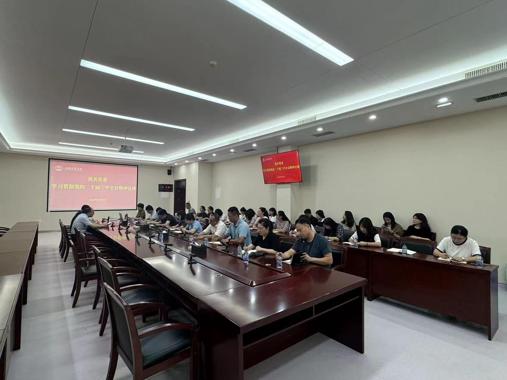 9月9日下午,机关党委在长清校区明德楼301会议室召开学习贯彻党的二十届三中全会精神宣讲会。机关党委书记闫荣双作宣讲报告,机关党委科级领导职务干部代表、各党支部党建联络员等参加宣讲会,宣讲会由机关党委组织员吕莹主持。